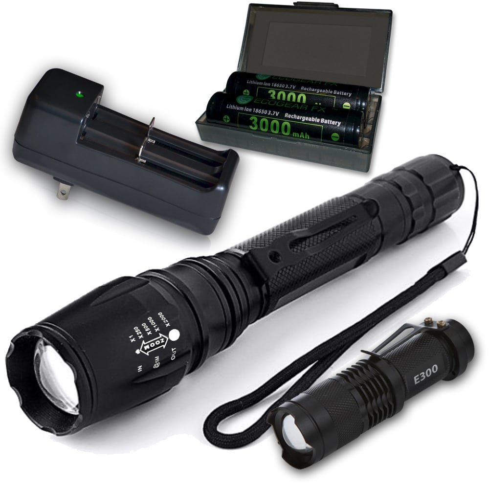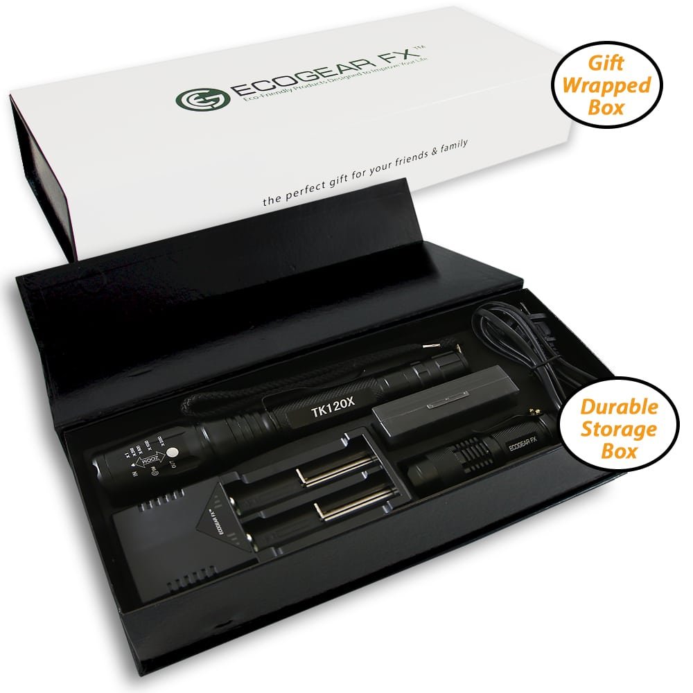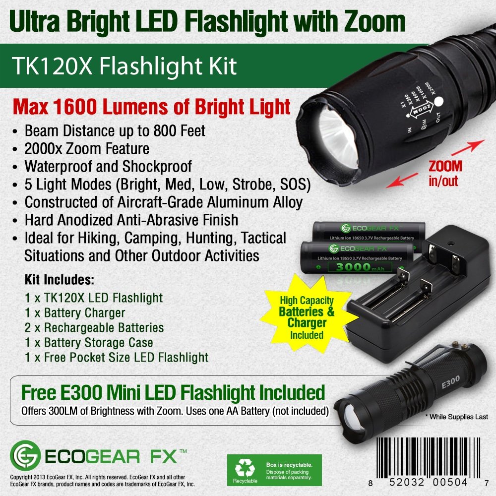 1 x TK120X LED Tactical Flashlight with Holster 1 x Attached Lanyard (removable) 1 x Attached Belt Clip (removable) 1 x Rapid Battery Charger 2 x Rechargeable Batteries 1 x Storage Case for Batteries 1 x Mini E300 LED Flashlight (battery not included) 1 x User Manual   The TK120X Tactical Flashlight with holster is a great choice for hunters, disaster workers, security guards or anyone who needs to see better at night. It’s rugged, durable and ready to go anytime.