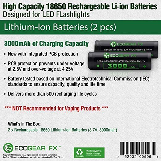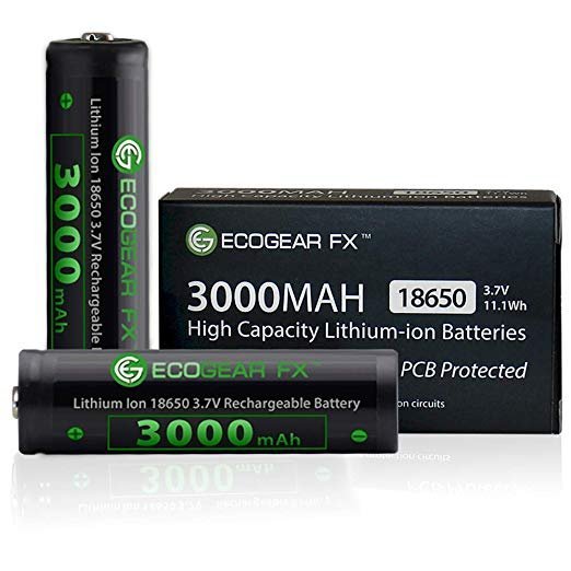 Best 18650 battery pcbHigh powered 18650 lithium flashlight batteries offering 3000mAh of reliable power. The EcoGear FX 18650 button top lithium-ion rechargeable batteries are unique and are packed with an amazingly amount of powerful energy. This is our best 18650 battery as it provides dramatically increased longevity, low self-discharge, efficiency and optimized usage time. The choice battery for LED tactical flashlights and battery-powered professional gear. When you think of batteries, what might come to mind  is what you have seen in most in the store aisles. There is the widely used AA or AAA alkaline size batteries. However, alkaline batteries are old out-dated technology and cannot match the power of lithium-ion batteries. These 18650 PCB lithium flashlight batteries deliver the power needed and offer up to 500 charging cycles. The 18650 button top battery is the best for using in LED flashlights, video doorbells, camping lanterns, indoor fans, portable radios, bluetooth speakers, work lights, motion lights, cordless power tools, solar yard lights and many other low drain devices. Lithium rechargeable batteries are also used in aerospace technologies applications (radio-controlled models, model aircraft, the Mars Curiosity rover, etc.). The 18650 PCB battery is protected with a small built-in electronic circuit which prevents overcharging and over-discharging. Features and Benefits: • Integrated PCB Protection • Lithium Ion 18650 cylindrical rechargeable batteries • Internal PCB protection prevents under-voltage at 2.5V and over-voltage at 4.25V • Higher energy density and lower weight than many other rechargeable 18650 lithium flashlight batteries Battery Specifications: • Capacity: Nominal&: 3000mAh, Minimum: 2600 mAh • Internal PCB protection prevents under-voltage at 2.5V and over-voltage at 4.25V • Nominal Voltage: Average 3.7V • Cut-off Voltage: 2.5V • Internal Impedance: less or equal to 180 milli-ohm (with PTC) • Cycle Performance: 90% of initial capacity at 400 cycles • Cycle life: > 500 cycles • Charge: Current = 0.5C (~1500mA) Voltage = 4.2 V End Current = 0.01 mA • Discharge: Current = 0.5C (~1500mA) End Voltage = 3.0V Product Dimensions • Diameter: 18.5 mm • Length: 68.7 mm These are the same lithium-ion batteries which were once top-selling on Amazon. Unfortunately, Amazon no longer allows the sale of many types of lithium-ion batteries including 18650 batteries. These batteries are NOT recommended for high-drain devices (i.e. Vaping Products). Sold as a 2-pack or available at wholesale bulk pricing.